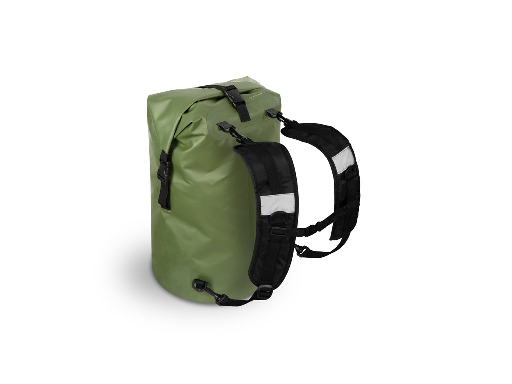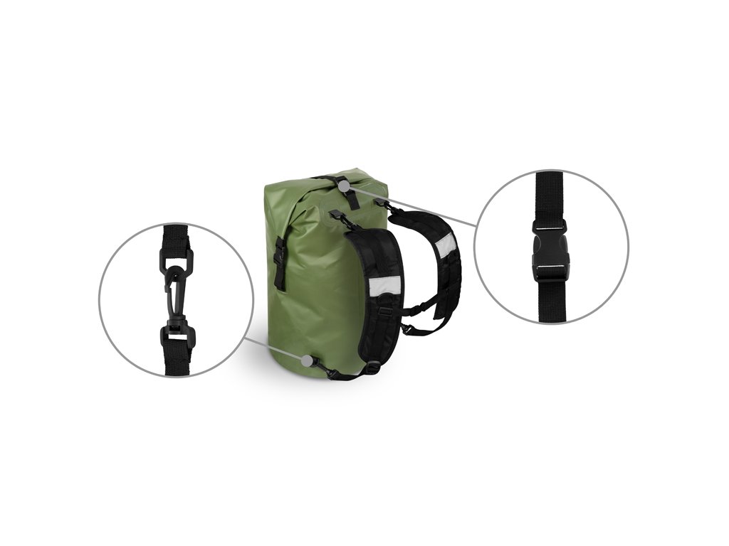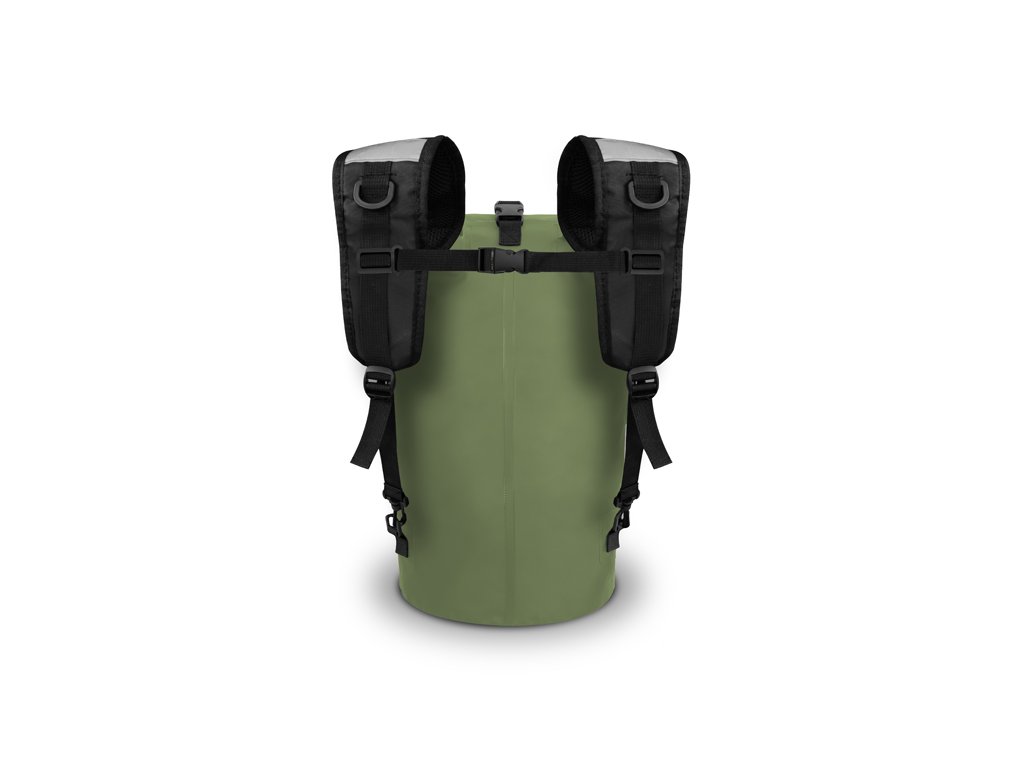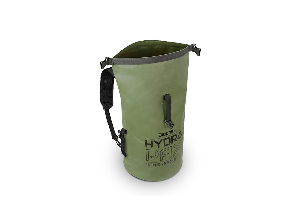 Kompletně nepromokavý batoh s odnímatelnými popruhy a univerzálním využitím jako EVA taška nebo klasický batoh. HydroPAX je vyroben z voděodolného EVA materiálu, který ochrání vaše náčiní, popřípadě oblečení před vodou a zároveň je velmi snadno udržovatelný. Povrch stačí přetřít hadříkem a během pár minut je suchý. Navíc pokud se vám vylije voda nebo jiná tekutina uvnitř, jednoduše ji vylijete a vnitřek očistíte. Zavírání batohu je zajištěno pomocí pevného popruhu se dvěma klipy na vrchu batohu, který si v rychlosti několikrát zarolujete a klipy zapnete o jejich druhou polovinu přichycenou na tašce. Pro dodatečné zajištění po uzavření slouží další plastový klip v horní části. Pro snadný a rychlý transport bylo přidáno praktické gumové držadlo a ramenní popruhy disponující sponami, pro uchycení na obou koncích, díky kterým je lze kdykoliv odebrat. Popruhy jsou dostatečně polstrované a z vnitřní strany jsme použili perforovanou tkaninu umožňující zlepšené odvětrávání během nošení. Jsou také nastavitelné, doplněné o plastový klip pro jejich vzájemné spojení a dvě odrazky pro zvýšení viditelnosti. Tmavě zelený materiál je doplněn černými doplňky a také zajímavou grafikou dodávající batohu osobitý styl.Doplňkové parametry