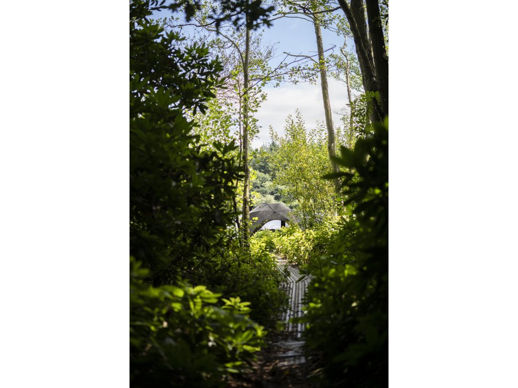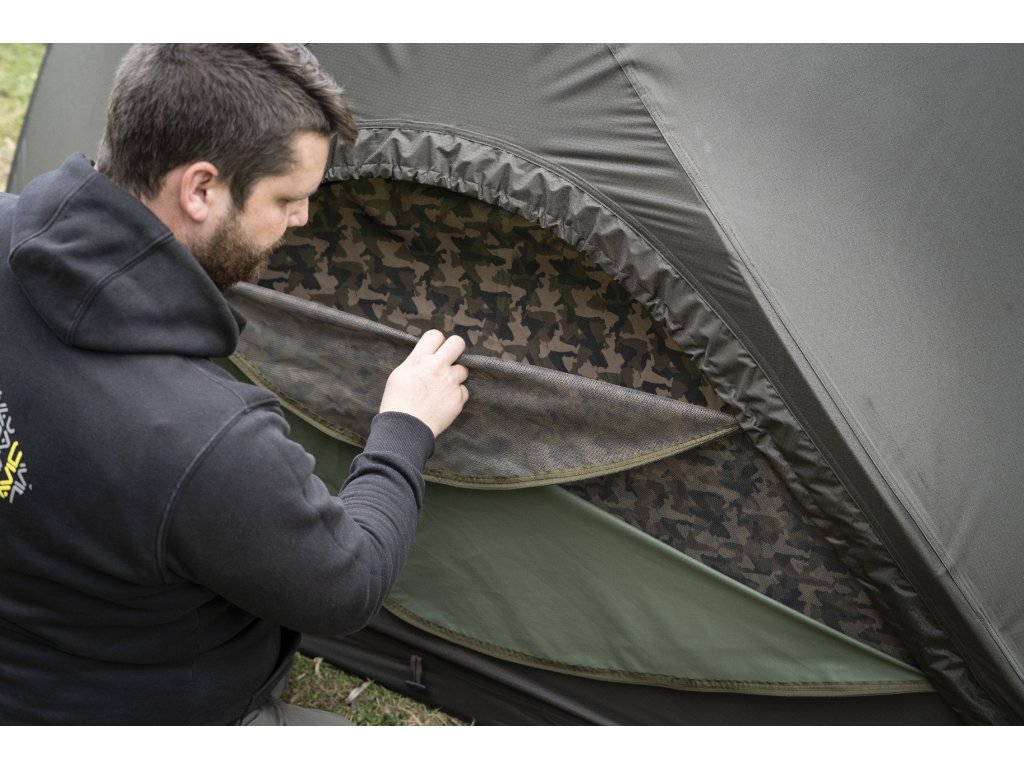 Na zadní straně je velké zipem otevíratelné okno s odepinatelnou camo moskytiérou, za níž je vnitřní plášť, který jde samozřejmě také rozepnout, aby bylo zajištěno dostatečné proudění vzduchu v celém brolly.