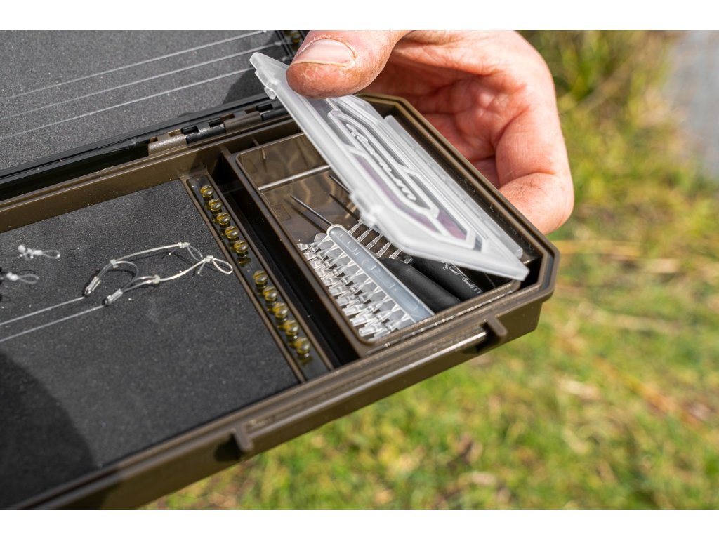 Navrženo pro umístění všeho, co potřebujete, přehledně na jednom pěkně organizovaném místě. Speci Rig Blox má několik jedinečných funkcí, které poskytují pevný domov pro vaše navázané háčky. Návazce drží úhledně na svém místě pomocí nových kolíčků. Na protější straně jsou přihrádky na bižuterii a kratší návazce.