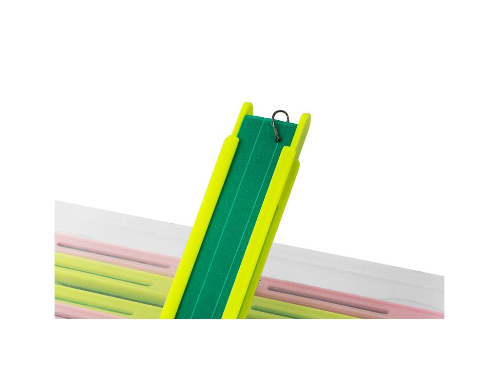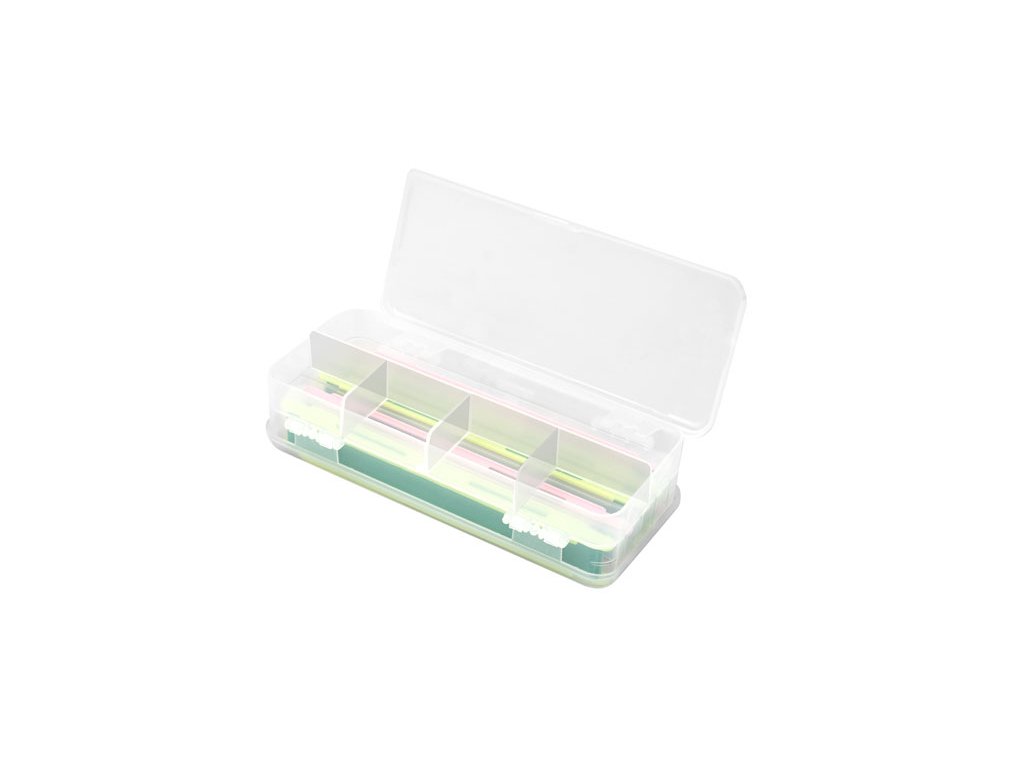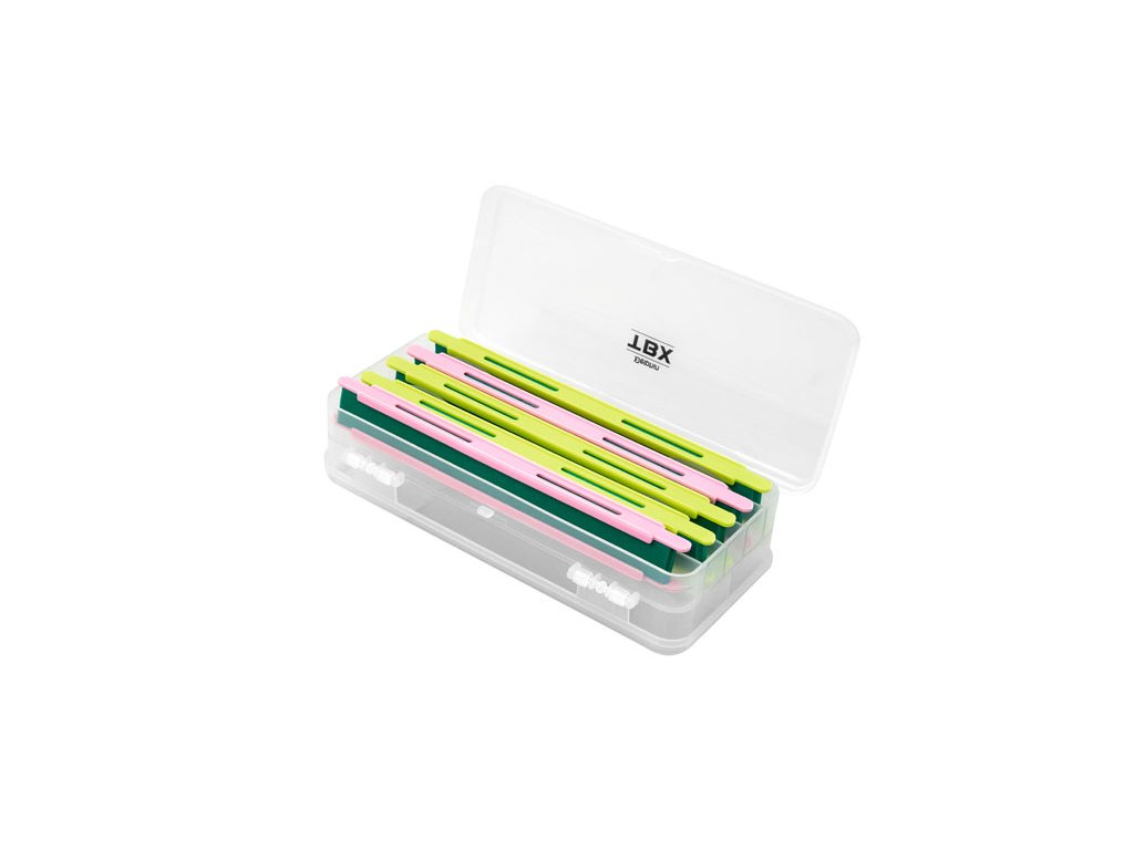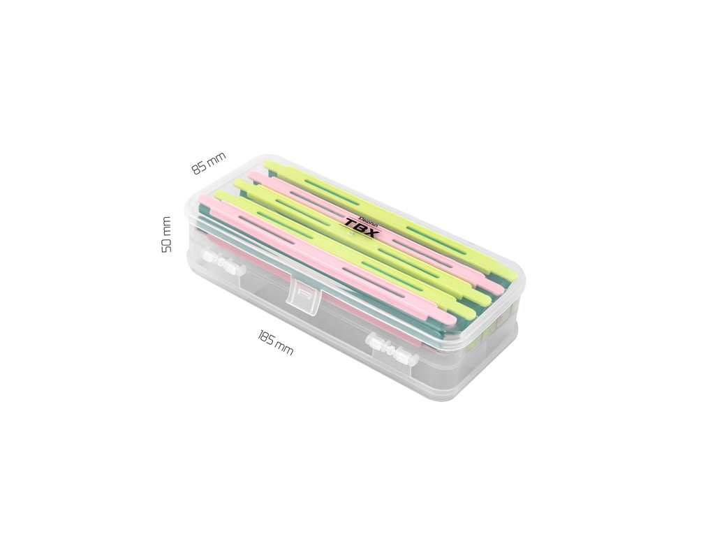 TBX Duo 185-5P EVA je multifunkčná krabička určená na uloženie rybárskeho príslušenstva. Vyrobená je z transparentného plastu, takže máte vždy prehľad o uložených veciach vo vnútri krabičky. Súčasťou balenia sú aj prípravky z EVA peny (v počte 5 kusov) určených upevnenie hotových nadväzcov, ktoré využije napríklad pri love na bič, feeder, plávanú a pod. Technické parametre: Rozmer: 185x85x50mm Počet pevných priehradiek: Rozmer priehradky: 1x(17,7x3,5x2cm), 4x(4,3x3,5x2cm) Počet vkladateľných prípravkov:Doplňkové parametry