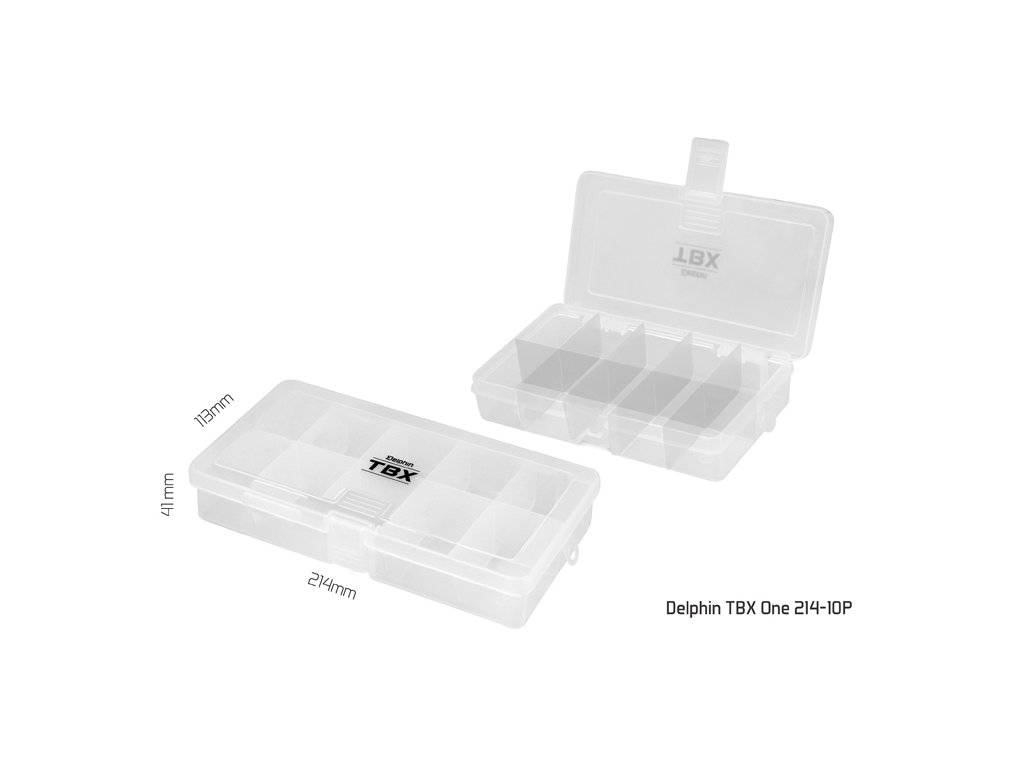 TBX ONE je řada multifunkčních krabiček určených pro uložení rybářského příslušenství. Vyrobené jsou z transparentního plastu, takže máte vždy dokonalý přehled o uložených věcech uvnitř krabičky. Řada TXB ONE je vybavena praktickými klipy z transparentního plastu. Technické parametre: Model: Delphin TBX One 132-10P Rozměr: 132x65x25mm Počet pevných přihrádek: 10 Rozměr přihrádky: 2,5x2,8x2,1cm Počet vkladatelných příčníků: 0 Model: Delphin TBX One 162-10P Rozměr: 162x86x35mm Počet pevných přihrádek: 10 Rozměr přihrádky: 3x4x2,9cm Počet vkladatelných příčníků: 0 Model: Delphin TBX One 186-10P Rozměr: 186x98x35mm Počet pevných přihrádek: 10 Rozměr přihrádky: 3,6x4,6x3,0cm Počet vkladatelných příčníků: 0 Model: Delphin TBX One 214-10P Rozměr: 214x113x41mm Počet pevných přihrádek: 10 Rozměr přihrádky: 4,1x5,4x3,5cm Počet vkladatelných příčníků: 0Doplňkové parametry
