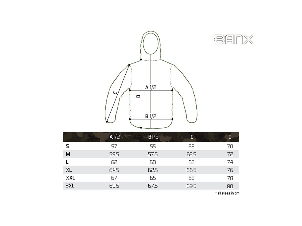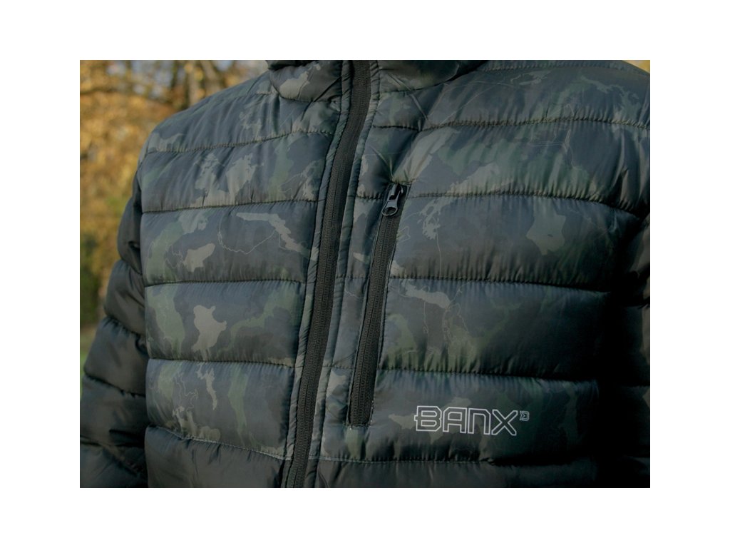 Zateplená bunda přinášející skvělý tepelný komfort během chladných, podzimních či zimních dní. Je vyrobena z tkaniny, která je příjemná na dotek a zároveň snadno udržovatelná, což je velmi praktické při použití během rybolovu a jiných outdoorových aktivitách. Bunda je zároveň příčně prošívaná, což vytváří stylový vizuální prvek produktu. Výplň bundy je extra lehká a zajišťuje výborné termoizolační vlastnosti. Zapínání je zajištěno pomocí kvalitního zipu, překrytého z vnější strany tkaninou, což zvyšuje jeho odolnost vůči vnějším podmínkám. Na obou stranách se nacházejí dostatečně velké kapsy na ruce nebo pro odložení potřebného příslušenství. Další kapsu naleznete na levé straně na hrudi a slouží k uschování mobilního telefonu, případně dokladů. Bunda Delphin BANX disponuje také kapucí, kterou lze zatáhnout pomocí stahovacího klipu. Rukávy jsou na koncích mírně zúžené a opatřené jemnou gumičkou, pro lepší obepnutí zápěstí. Design se skládá z černé barvy, kterou stylově doplňuje naše patentovaná kamufláž BANX. Díky této kombinaci ji můžete využít nejen při rybolovu, ale také k běžnému nošení. Podle přiložené velikostní tabulky si prosím zkontrolujte vyhovující velikost. Materiálové složení: 100% Polyester Pojem BANX vyjadřuje patentovanou kamufláž z dílny značky Delphin, která v sobě nese hluboký vzkaz. Jedinečné designové prvky, ze kterých je složená, jí dodávají nezaměnitelný charakter a dělají z ní více než jen vizuální vzor. Kamufláž BANX zobrazuje přesně to, co spojuje naši rybářskou vášeň napříč celou Evropou. Jsou to jezera, řeky či jiné vodní plochy. Od vod rumunského pobřeží, přes vodní nádrže na Slovensku až po ikonická jezera Evropy napříč Německem, Itálií až po úplný západ Evropy ve Španělsku. Právě siluety těchto jezer jsme spojili a vytvořili tak jedinečnou kamufláž s názvem BANX. Není to jen kamufláž - je to mapa. Mapa, která svým precizním designem zobrazuje ty nejznámější revíry Evropy, díky nimž bude vaše výbava vypadat maximálně jedinečně a originálně.Doplňkové parametry