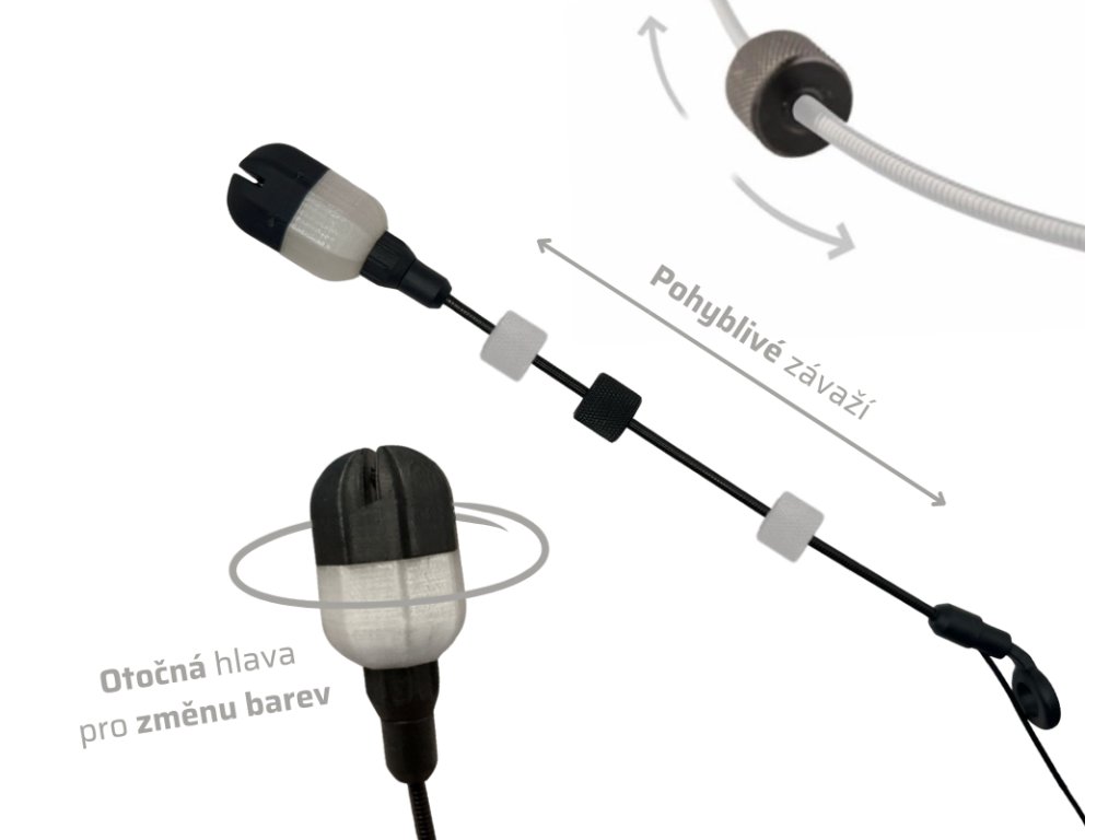 Díky otočné konstrukci hlavního těla můžete rychle měnit barvu signalizace podle aktuální potřeby nebo světelných podmínek – modrá, červená, fialová, zelená, žlutá, tyrkysová, bílá a možnost LED zcela vypnout. Každá pozice umožňuje jasnou identifikaci prutu a perfektní přizpůsobení stylu lovu.