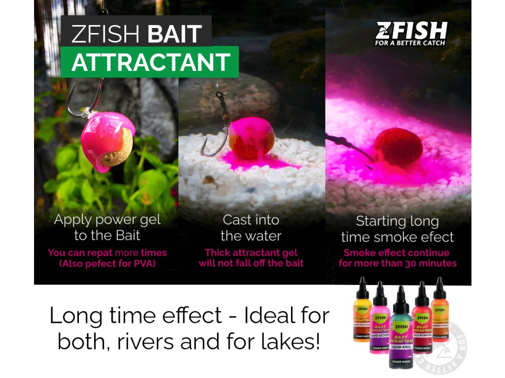 ZFISH Bait Attractant je náš nový revoluční dip, který dodává nástrahám onu třešničku na dortu! Jeho hustota zajišťuje, že neopadává a že se rozpouští déle než běžné tekuté dipy. Ve vodě vytváří skutečný harmonický oblak, který se rychle šíří po okolí, a tím rychleji přiláká ryby na náš háček! Aromatický oblak, který vzlíná z nástrahy, prostě musíte vidět, abyste uvěřili a právě proto je náš Bait Atractant tak revoluční. Obsahuje pečlivě vybrané a vyvážené komponenty, atraktory a chuťové stimulátory, které u ryb velice účinně podporují apetit a dokáží je přilákat k nástraze ať už jsou kdekoli ve sloupci. Dip lze použít také do spod mixů, jako přídavek do práškového krmení a skvěle se osvědčil na feederových a kaprařských závodech! Lze jej používat po celý rok a navíc nerozpouští PVA materiály. Dostupný je v 5-ti stejných příchutích jako většina našeho krmného programu.