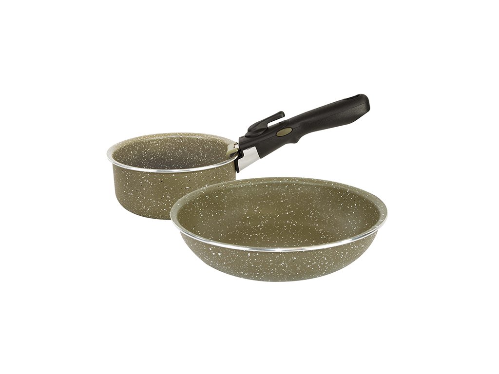 Medium – sada obsahuje hrnec (ø18 × 7,8cm), pánev (ø24 × 5cm) a rukojeť