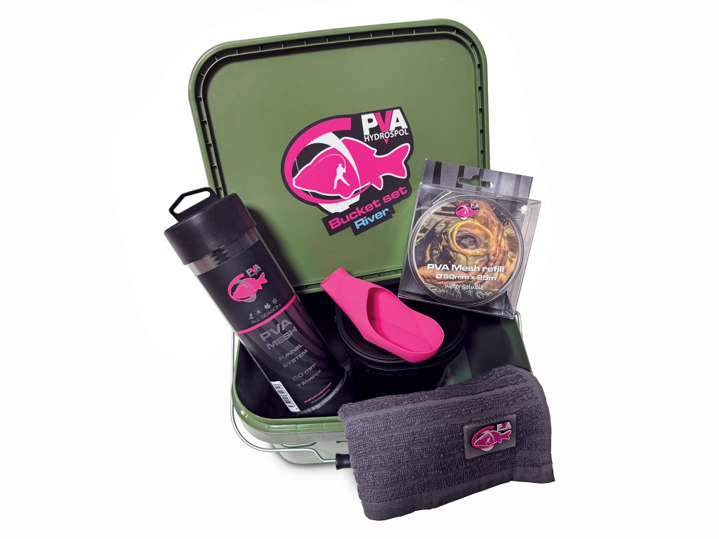 PVA Hydrospol - Bucket set River, jak název napoví, tento set je vhodný pro rybáře trávící většinu svých vycházek na řekách, ale i pro ty, kteří potřebují dostat co nejvíce krmení do co nejkratší PVA punčochy.