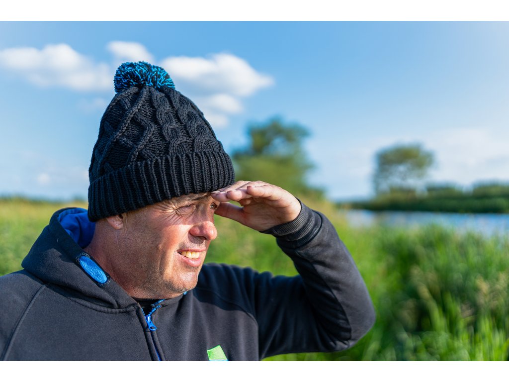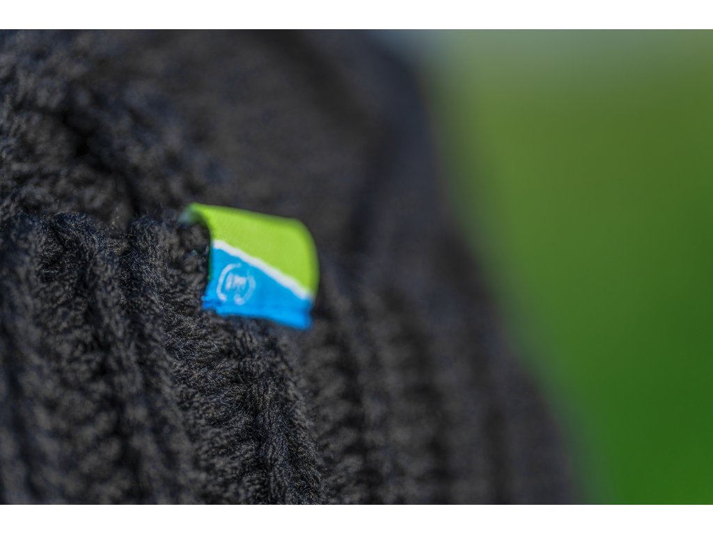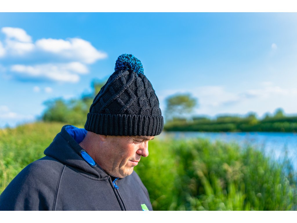 Pletená čepice s bambulí v černé barvě s akcentem modro/černé bambulky. Má hřejivou fleecovou podšívku, takže je ideální pro nejchladnější zimní dny u vody.