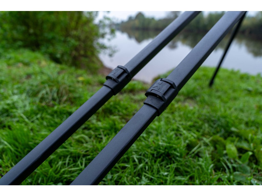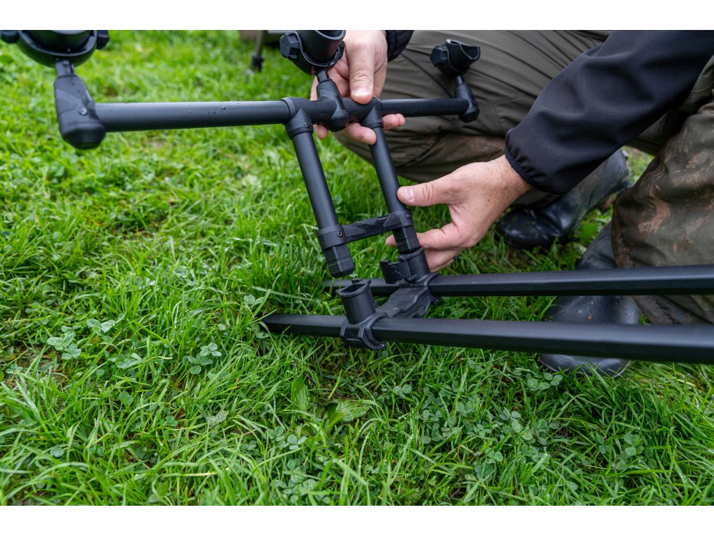 Nabízí maximální stabilitu a všestrannost. Dvojitý rám lze během používání prodloužit, ale díky vačkovým zámkům cam lock jej lze úhledně sbalit, takže je při přepravě kompaktní. Stojan je lehký a přenosný.Mohutné hrazdy na 3 pruty se připevňují pomocí vačkových spínačů pro rychlé sestavení a sbalení. Připevnění na dvou místech nyní dokonale odstraňuje jakýkoli pohyb nebo nevyváženost. Zadní hrazda je přizvednutá, aby umožnila dostatečný prostor pro snadné uložení tří velkých navijáků. Přední nohy lze nastavit do téměř libovolného úhlu a mají také možnost nastavení výšky pomocí vačkových spínačů. Nohy se prodlužují od 1 m do 1,85 m. Kompletní s jednoduchým obalem pro přepravu.