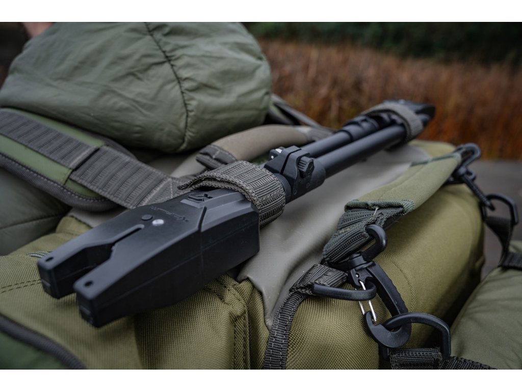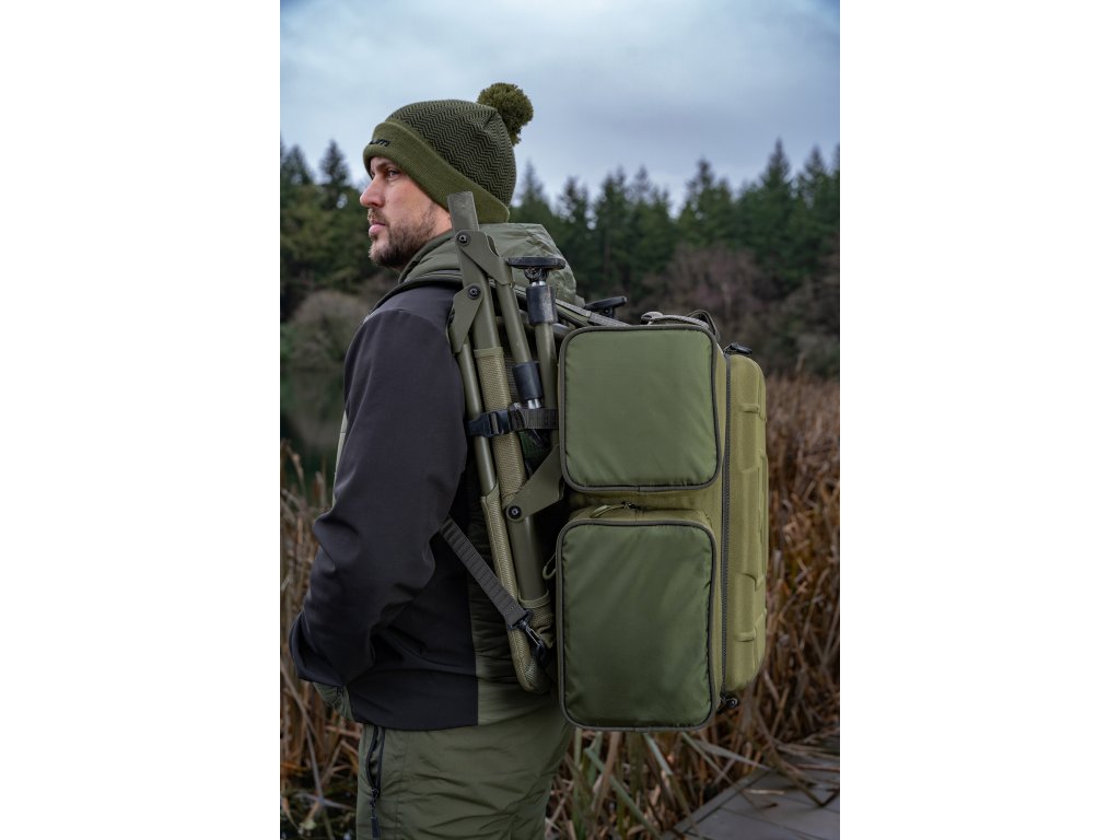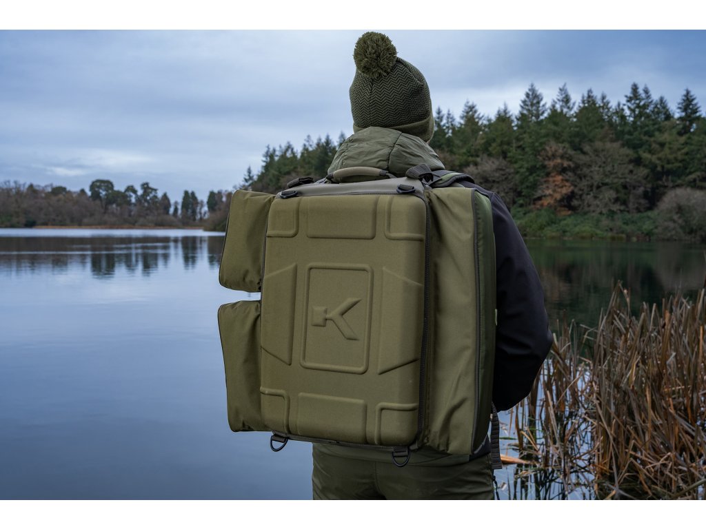 Korum Progress XT Ruckbag 45 litrů, velkokapacitní řešení pro přepravu rybářského náčiní se strategicky umístěnými bočními kapsami. Je vybaven nastavitelným hákem na přenášení židlí Korum, který umožňuje připevnit židle různých velikostí. Na dně je také dvojice poutek ve tvaru písmene D pro připevnění rolovací podložky Korum Progress. S polstrovanými ramenními popruhy a hrudním popruhem.