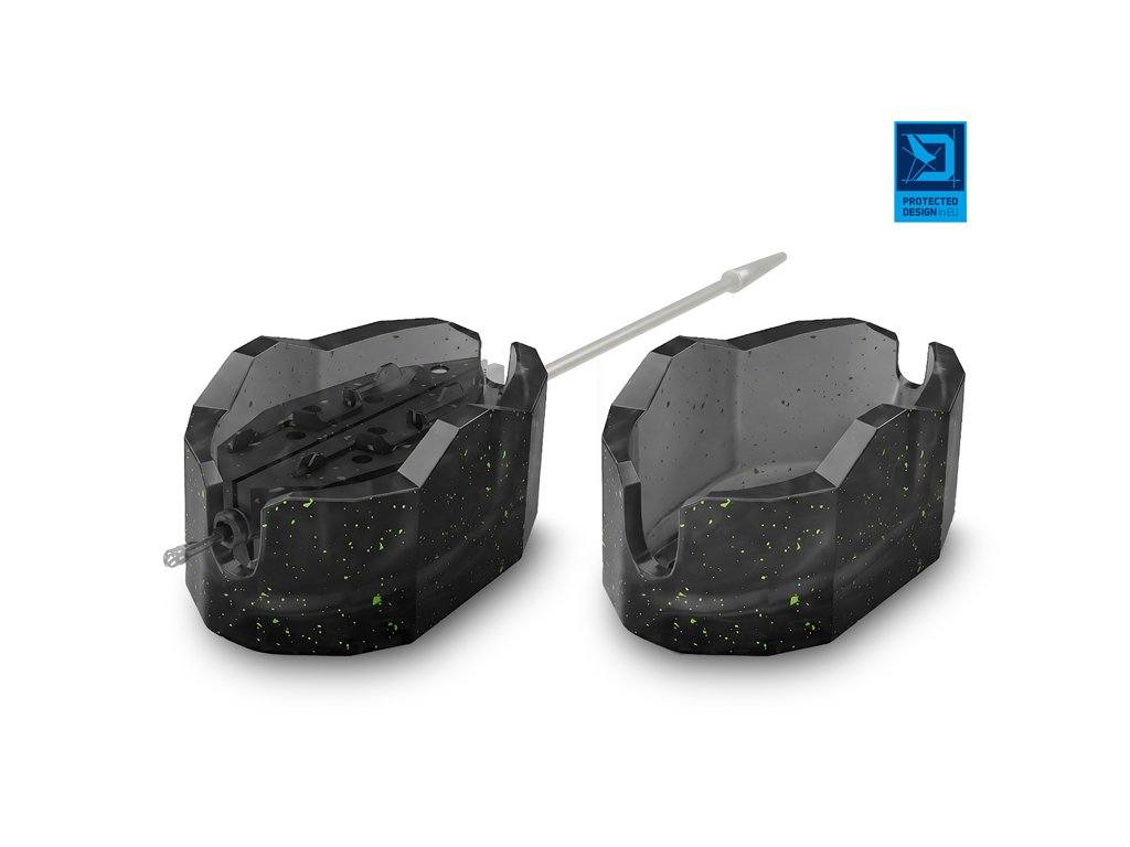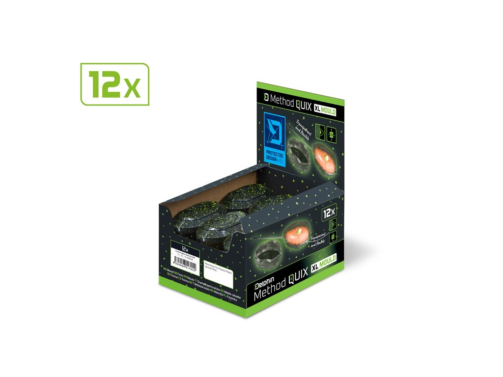 Forma Method QUIX REAXE XL představuje nezbytný doplněk vaší feederové výbavy, který umožňuje rovnoměrné naplnění method feederového krmítka. Tím dosáhnete efektivního rozpadu krmné směsi a tu nejatraktivnější prezentaci vaší nástrahy na dně. Hlavní předností formy je její ergonomický tvar a samotné vlastnosti použitého materiálu. Jedinečný tvar formy byl kompletně navržen designovým týmem značky Delphin. Průsvitnost materiálu zaručuje výbornou viditelnost nástrahy i přes gumovou stěnu, díky čemuž můžete dokonale přizpůsobit její polohu v krmítku. Extra měkkost materiálu umožňuje kontrolovat tlak vynaložený na obsah uvnitř, a tím dosáhnout co možná nejlepšího rozpadu krmení ve vodě. Tvar formy je uzpůsoben pro rychlou manipulaci a co nejjednodušší odnětí z krmítka. K hladké manipulaci přispívají dva výrazné boční výstupky a speciálně profilovaná spodní strana s drážkami a logem Delphin. Tyto prvky přesně znázorňují ideální místo stlačení, čímž se předchází nechtěnému rozpadu krmné směsi při vyklápění. Celkový tvar a velikost formy jsou navrženy tak, aby bezvadně pasovaly na model krmítka Delphin Method QUIX XL, ale díky univerzálnímu provedení ji bez problémů využijete i při ostatních běžně dostupných method feederových krmítkách v dané velikosti. PROTECTED DESIGN Tento produkt byl kompletně navržen designéry značky Delphin. Jeho design a technické řešení jsou natolik unikátní, že je registrován a chráněn na území celé Evropské unie.Doplňkové parametry