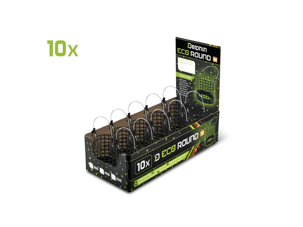Model krmítka Delphin ECO ROUND díky svému tvaru umožňuje efektivní vnadění i při použití hrubší směsi, jako je například vařený partikl či pelety. Přidaná ocelová zátěž vytváří těžiště na spodku košíku, díky čemuž krmítko dokonale letí a je tak vhodné i na daleké hody. Samotný košík je vyhotoven z pevného drátu, který spolehlivě odolává náročným podmínkám a mechanickému poškození. Válcovitý tvar zajišťuje rychlé uvolnění krmné směsi ihned po dopadu na dno. Oproti klasickým krmítkům na daleké hody se „slzou“ na spodku nabízí model ECO ROUND rychlejší rozpad objemnějších částí krmiva. Stačí naplnit hrubou směs, zajistit ji z obou stran sypkým krmením a po dopadu na dno krmítkem jemně zatáhnout. Jednou z předností krmítka je jeho ekologická ocelová zátěž. Toto řešení umožňuje bezproblémový lov i na revírech, kde platí přísný zákaz používání olova. Černé barevné provedení se zeleným frkáním zajišťuje dokonalé splynutí se dnem a vizuálně ladí s ostatními produkty z feederové série REAXE. Dostupnost v různých průměrech a gramážích vám umožní přizpůsobit se aktuálním podmínkám u vody.Doplňkové parametry