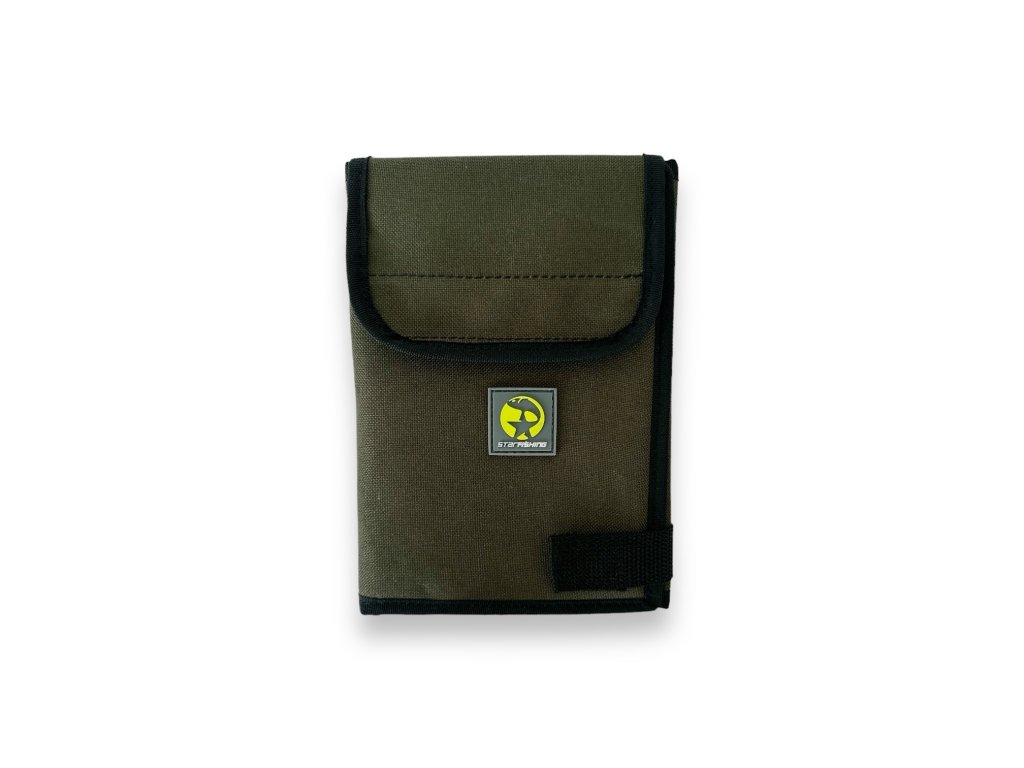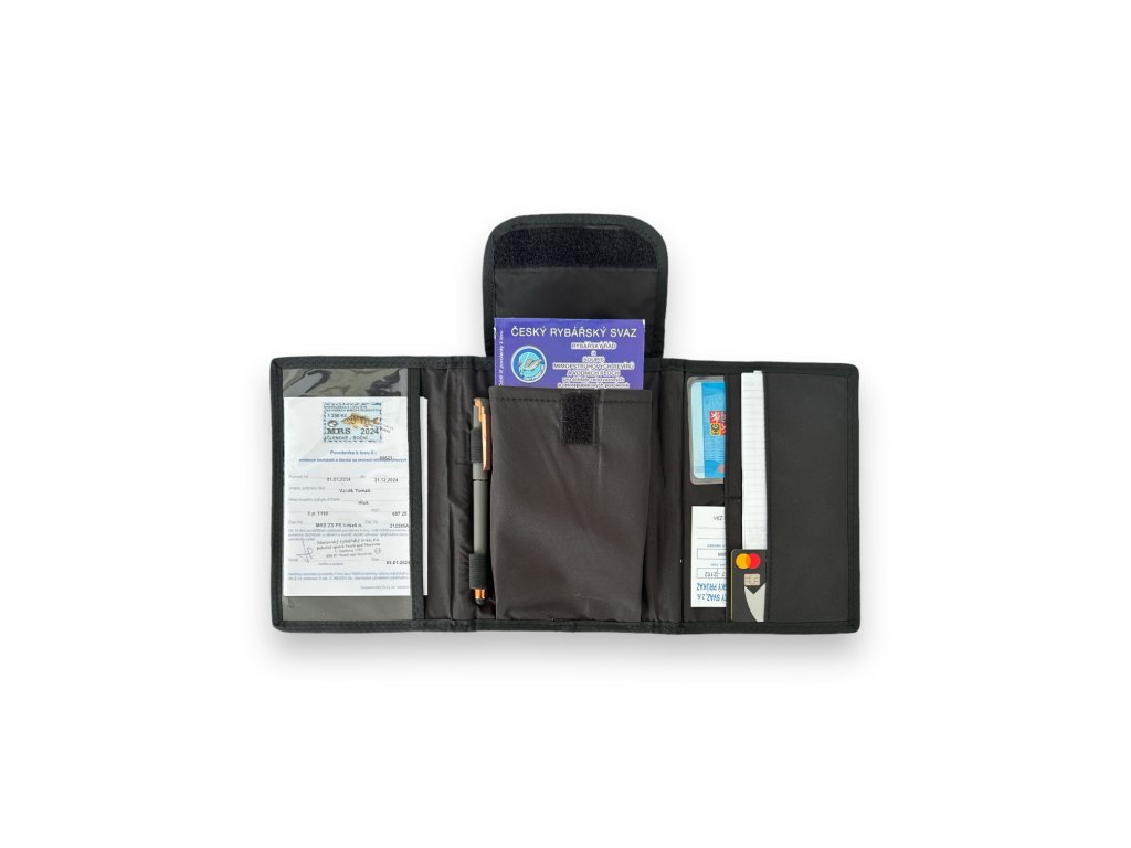Púzdro je rozdelené na tri segmenty, v strede púzdra je veľké vrecko s vysúvacím zámkom na rybárske predpisy a inventár pre držiteľov celoštátnych a celoštátnych povolení, ale možno do neho vložiť aj smartphone s uhlopriečkou 6,7" a viac, sú tu aj gumené pútka na vloženie pera. Na ľavej strane sa nachádza jedno veľké sľudové vrecko na vloženie dokumentov alebo napríklad rybárskych predpisov. Na pravej strane je priestor na vloženie napríklad členského preukazu, rybárskeho lístka, príručného kalendára, sčítacieho hárku, kreditnej karty a iných drobností.