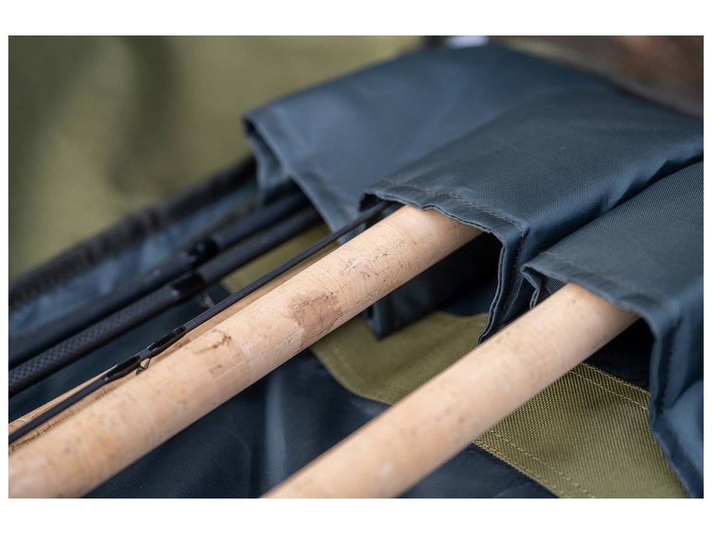 Přihrádka na pruty se odklápí od zadní přihrádky na přístřešek a poskytuje všechny výhody toulce s dodatečnou ochranou prutů. Má velkoryse polstrovaný prostor navržený pro pohodlné uložení navázaných prutů a navijáků a větší zadní přihrádku, do které se vejdou všechny přístřešky a deštníky Korum. Je také vybaven jednoduchou vnější kapsou na podběrákové hlavy a rukojeti nebo vidličky. K dispozici je také vnější toulec a popruh, pro mokré předměty, jako jsou přístřešky, stojany a pdoběrákové hlavy. Doplněno odnímatelným nastavitelným polstrovaným ramenním popruhem pro pohodlnou přepravu.