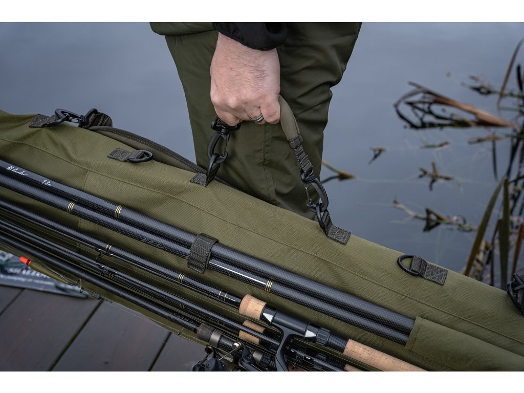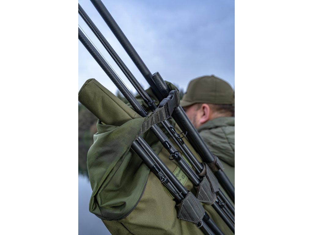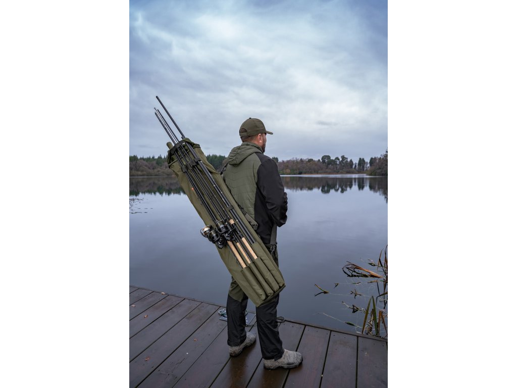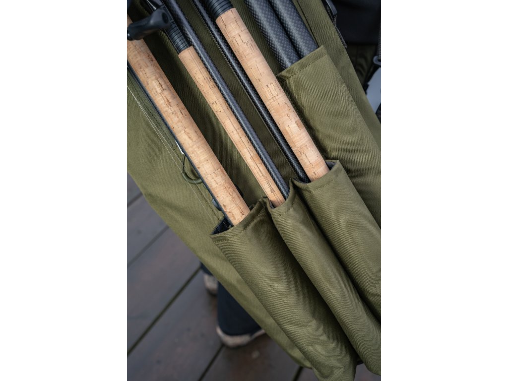 Pohodlně pojme tři pruty s dostatečnou vnitřní kapacitou pro brolly a přístřešky na přenocování. Upraveno tak, aby poskytovalo na míru šitou plochu pro rukojeť podběráku. Obsahuje jednoduché vnější kapsy pro vaše náčiní a příslušenství k židli. Hlavní prostor je vybaven uzavíratelnou rolovací funkcí. Odnímatelný a nastavitelný polstrovaný ramenní popruh pro pohodlnou přepravu.