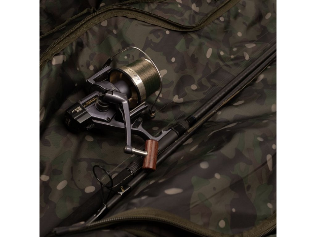 Dvoucestný, odolný hlavní zip zajišťuje rychlý a snadný přístup k vašim prutům a navijákům. Rozšířené části špiček, spojené s vnitřním polstrováním, pojmou bez problémů 50 mm očka a zajistí, že budou vaše pruty během přepravy chráněny. Každý prut je oddělen vnitřním, polstrovaným pouzdrem a zajištěn na místě pomocí vnitřních neoprenových pásků. K dispozici je i další popruh a elastická smyčka, kterou lze použít pro uložení kobry, takže i ona může těžit z polstrované ochrany. Nadrozměrná část pouzdra na naviják je silně polstrovaná a velkoryse dimenzovaná, aby ochránila i ty největší navijáky. Obě strany pouzdra NXC 3 Rod Sleeves mají velké vnější kapsy na zip, které jsou vhodné pro podběráky, vidličky a další příslušenství. Na zadní straně je na základně velká otevřená kapsa, kam můžete uložit další prut, který lze zajistit pomocí napínacích popruhů. Do další, menší otevřené kapsy na zip lze umístit podběrák nebo uložit distanční tyče. Hned pod hlavním zipem je úhledně umístěná kapsa na zip pro uložení olov.