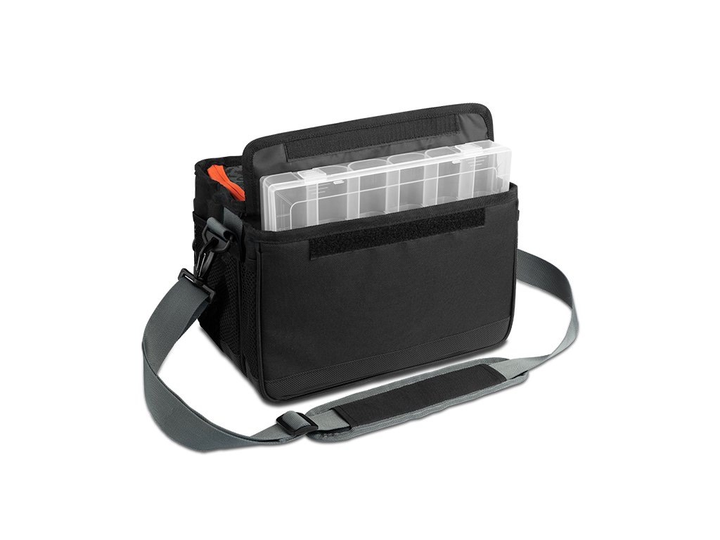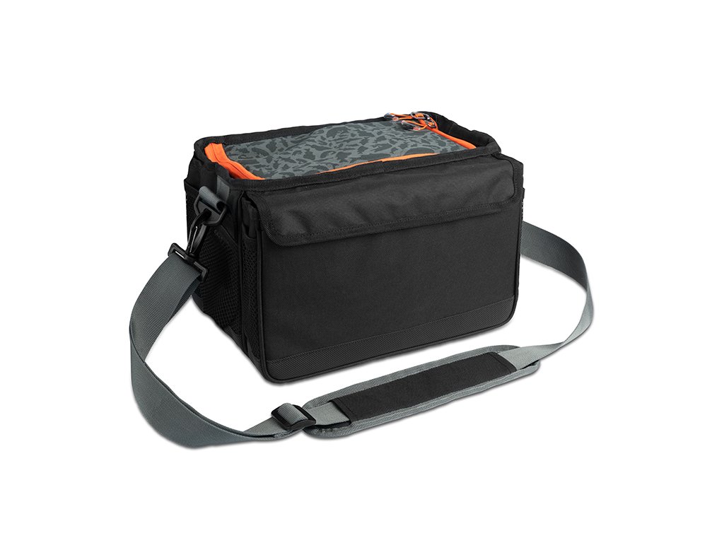 Důmyslně propracovaná a praktická taška v elegantně-sportovním Darx ATAK! designu. Díky svým parametrům je ideální volbou pro kratší vycházky k vodě a dokonale zapadne do výbavy každého příznivce přívlače. Tašku jsme navrhli tak, aby byly všechny odkládací prostory pro lovce dobře přístupné i v případě, kdy ji mají právě na sobě při lovu. Proto jsme navrhli víko vnitřního prostoru tak, aby jej bylo možné otevřít směrem od rybáře. Vnitřní prostor lze předělit příčkou na suchý zip a také je možné si jej přizpůsobit dle vlastních potřeb. Na obou stranách se nachází předělená kapsa ze síťoviny, do kterých lze odložit drobnosti. V zadní části se nachází kapsa na suchý zip, která obsahuje jednu plastovou krabici s vyjímatelnými příčkami. Krabice je součástí tašky a je vybavena odnímatelnými vnitřními příčkami. Na přední části je umístěna i kapsa na zip, která poslouží například na odložení rybářských dokladů, peánu a pod. Navržena byla s důrazem na praktičnost, trvanlivost a odolnost. Brašna je ze všech stran osazena polstrováním pro maximální ochranu vašeho příslušenství uvnitř. Celá spodní část tašky je osazena vyztuženou, 5cm vysokou, nepromokavou vrstvou, která dovoluje položení tašky na mokrý povrch. To ještě více přispívá k tomu, že taška je také na spodní straně mimořádně stabilní a drží si svůj tvar. Kvalitní vnější zipy oranžové barvy jsou opatřeny plastovým taháčkem na oranžovém popruhu, který je na konci rozšířen, a proto jej lze rychle uchopit. Doplňky oranžové barvy umožňují rybáři, aby byla taška dobře viditelná i za šera a uměl ji okamžitě najít. Taška je ušita z lehké, ale přitom odolné látky černé barvy. Vybavena je černým popruhem určeným pro nošení přes rameno. Design tašky doplňuje naše jedinečná tmavá Darx ATAK! kamufláž se siluetami dravých ryb. Technické parametry: Rozměr tašky: 31x23x22cm Čistý rozměr vnitřního prostoru: 28x20x19cm Rozměr přední kapsa:29x21cm Rozměr krabice: 27 x 18 x 4cm Počet přihrádek: 6-18 Možnost náhradní krabice: TBX One 275 – 1P Clip WP, TBX One 275 – 3P Clip WP, TBX One 276 – 16P Clip, TBX One 273 – 5P ClipDoplňkové parametry