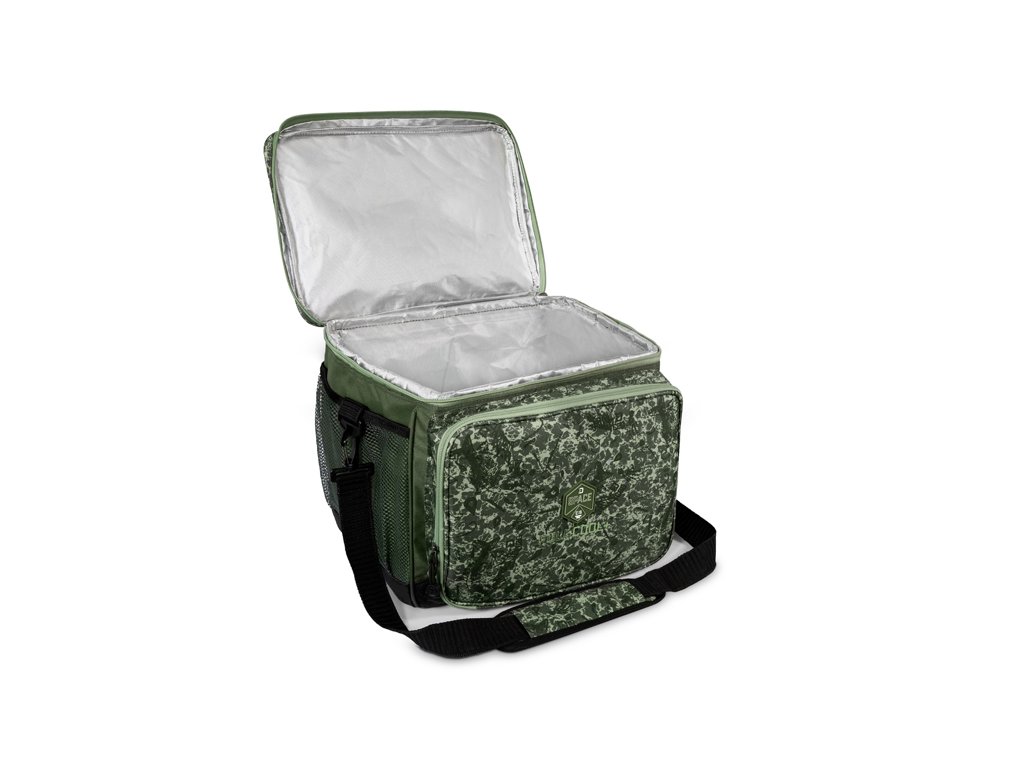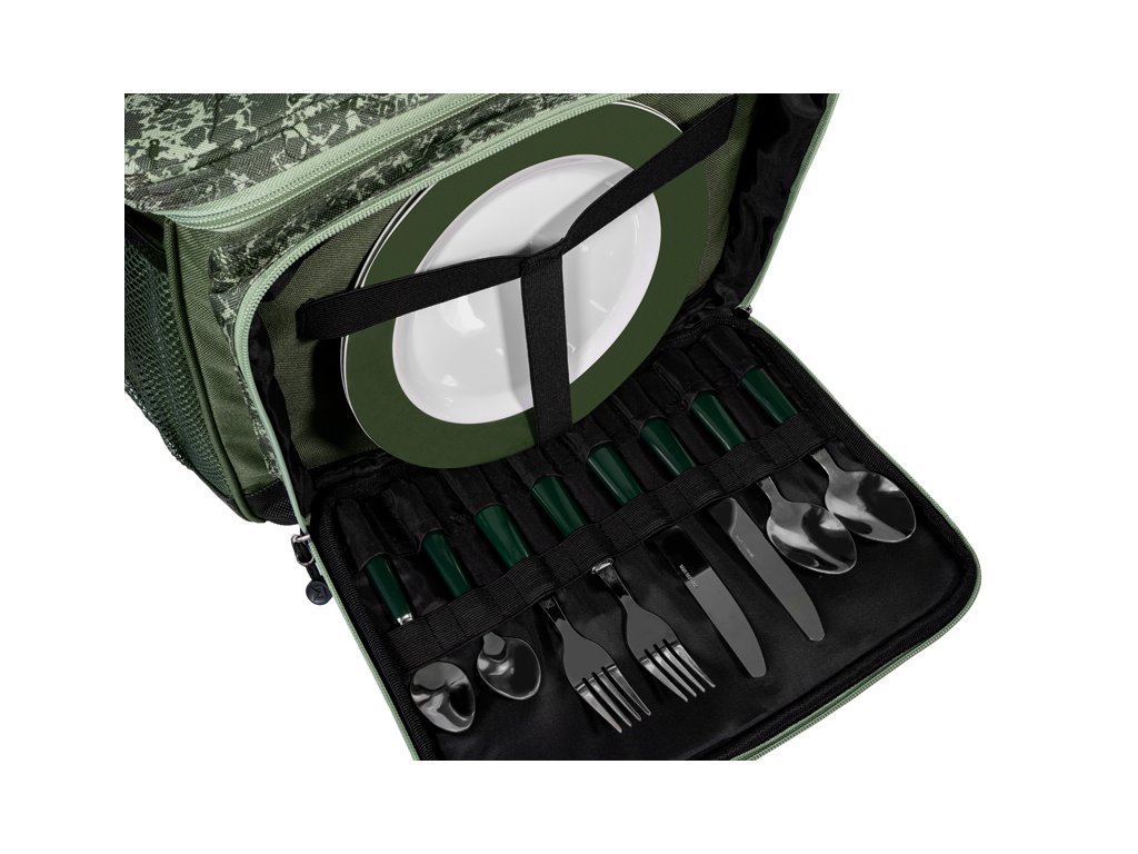 Delphin SPACE je označení pro exkluzivní sérii tašek z dílny značky Delphin. Vyznačuje se špičkovým zpracováním, kvalitními zipy, ale zejména výjimečným designem s použitím C2G kamufláže. Termotaška s příborem Delphin FullCOOL C2G je určena na převoz potravin s potřebou co nejdelšího uchování jejich původní teploty. Celá taška je z vnitřní strany opatřena termovrstvou. Zároveň je osazena polstrováním o síle 8mm, což zajišťuje její stabilitu, i když je prázdná. Tato vrstva polstrování se chová jako dodatečný izolant a zvyšuje tak dobu uchování potravin. Termoizolační vrstva byla navržena tak, že překrývá vnější okraj o 1cm a zároveň je všitá i pod celý obvodový zip. Výrazně tím prodlužuje dobu ochrany nástrah či potravin. V případě, že by tato vrstva nebyla všitá pod zipem, vzduch proudící přes zip by mnohem rychleji vnikal dovnitř. Taška je z boku dodatečně osazena dvěma síťkami, které slouží jako úložný prostor. V přední části je velká kapsa, ve které je umístěna kompletní jídelní sada pro dvě osoby. Obsahuje dva kusy plastových talířů, dva nože, dvě vidličky, dvě lžíce a dvě malé dezertní lžičky. Odteď si můžete dopřát více komfortu, i když jste u vody se svou polovičkou nebo parťákem! Pro pohodlné nošení je taška FullCOOL C2G vybavená odepínatelným pásem na rameno a měkce polstrovanou rukojetí. Stylová patentovaná kamufláž z dílny značky Delphin pod označením C2G má mnoho podob a úhlů pohledu. Přesně tak i její název, který můžeme volně přeložit jako Carpath 2. generace, což přímo odkazuje na jejího předchůdce, ale můžeme jej číst i jako Carpath to Green, tedy přechod myšlenky Carpathu do zelené barvy. Její jedinečnost a nezaměnitelnost spočívá v prvcích, ze kterých je vytvořena. Na první dojem jde o kamufláž tvořenou třemi různými odstíny zelené. Všechno se však změní při detailnějším pohledu, kdy si všimnete siluety kaprů, komponent kaprařské montáže a log značky Delphin spolu s označením C2G. Díky tomuto neopakovatelnému provedení se vaše rybářská výbava okamžitě stane jedinečnou a maximálně originální.Doplňkové parametry
