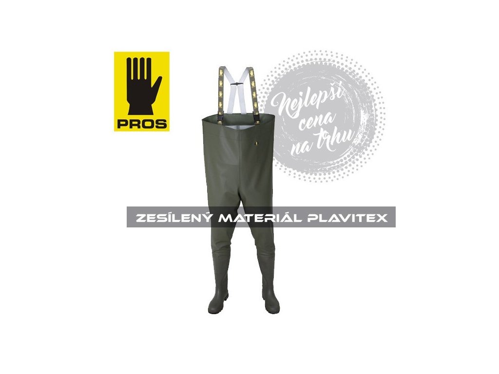 Exkluzivní brodící kalhoty s označením SB01 značky PROS, která patří mezi největší výrobce nepromokavé obuvi v Evropě. Jsou vyrobeny z originálního materiálu PLAVITEX s tloušťkou 0,7mm (zesílený PVC / Polyester) 700g / m2. PLAVITEX je extrémně odolná technická tkanina odolná vůči mechanickému poškození, která je doplněna dvojitými podlepenými švy zabezpečujícími dokonalou odolnost proti přetečení. Exkluzivitu těchto prsaček dotvářejí kvalitní boty 400P s pevnou černou podrážkou. Samozřejmostí jsou elastické šle s rychlopřezky, stahovací šňůrka na hrudi, vnitřní kapsa a také certifikát produktu splňující požadavky Evropské normy EN343 o voděodolnosti.Doplňkové parametry