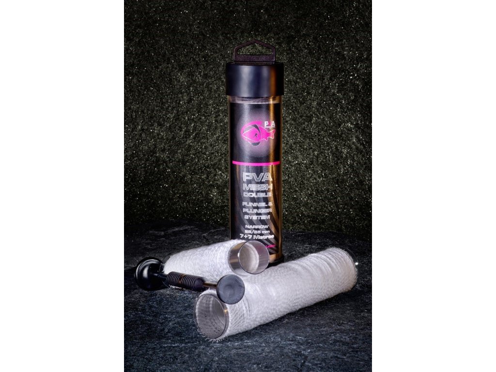 Prvotřídní PVA punčocha včetně tubusu a pěchovače. Evropský výrobce PVA produktů společnost PVA Hydrospol Vám přináší double systém 2V1 s micro-mesh síťkami 25 mm a 35 mm v jednom tubusu. Skvělá varianta pro rybáře, kteří používají oba průměry punčoch, jsou nyní dostupné ve výhodném balení. Všechny naše punčochy jsou pletené z kvalitních japonských vláken formou hustého micro-meshe. Naše punčochy můžete plnit sypkými materiály nebo drobnými peletami, aniž by vám zvolená směs propadávala úpletem punčochy. Čas rozpustnosti závisí na teplotě vody. V teplé vodě se doba rozpadu pohybuje okolo 45 sekund, naopak v ledové vodě to může být až 8 minut. Veškerý náš PVA program je vhodný pro celoroční použití.
