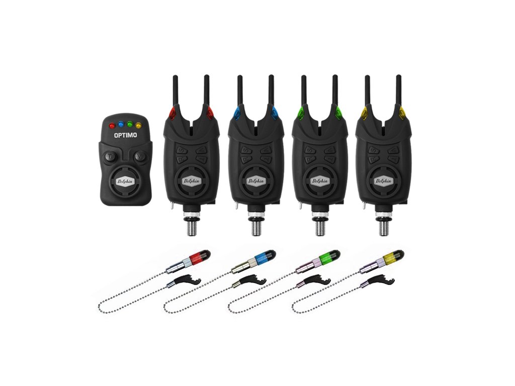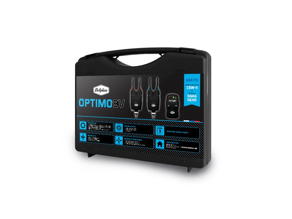 Sada Delphin OPTIMO navazuje na enormní úspěch sad od značky Delphin. Tato sada poskytuje možnost světelné, zvukové i vibrační signalizace. Je 100% voděodolná a signalizátory jsou napájeny 9V bateriemi, což zaručuje dlouhou životnost. Přijímač je napájen 3xAAA (mikrotužky) bateriemi. Kromě vysoké výdrže patří mezi největší výhody této sady dosah- až 200 metrů v závislosti na okolních podmínkách! Snag Geary (rohy) je možné šroubovat přímo na závity, které se nacházejí na těle signalizátoru, což jednoznačně usnadňuje manipulaci. Při nastavování sady na lovném místě určitě oceníte i 20 sekund trvající tichý mód, během kterého můžete se signalizátory manipulovat bez vydávání tónů. Další možností je nastavení až 6 stupňů citlivosti záběru v rozmezí 1,5-10,5cm. Signalizátory mají 2 hlavní režimy- denní a noční. Při nočním je samozřejmostí svícení poziční diody. Signalizátory mají možnost nastavení tichého režimu a rozeznávají zpětný záběr. Navíc signalizátor záběru OPTIMO disponuje pamětí pro nastavenou výšku a tón signalizace, které si zapamatuje i po vypnutí! Sada Delphin OPTIMO 9V je tím pravým pro opravdové kapraře! Základní sadou která se nachází v pevném přenosném kufříku je 2 + 1, ale sadu je možné rozšířit až na 4 + 1 dokoupením signalizátorů, kdy obsahuje: 4x vodě odolný signalizátor, 1x přijímač, 4x signalizátor CSW-II a 4x pár Snag Gear. Ke každému zakoupenému hlásiči tedy přísluší řetízkový signalizátor a namontovatelné snag gear ZDARMA! Záruka je prodloužena až na 3 roky co jen dokazuje vysokou kvalitu tohoto produktu! Do kufříku této sady je možné uložit maximálně konfiguraci 3 + 1 (3ks signalizátorů a jeden přijímač). Sada 2+1 obsahuje vždy modrý a červený signalizátor. Sada 3+1 obsahuje vždy modrý, červený a zelený signalizátor. Sada 4+1 obsahuje vždy modrý, červený, zelený a žlutý signalizátor.Doplňkové parametry