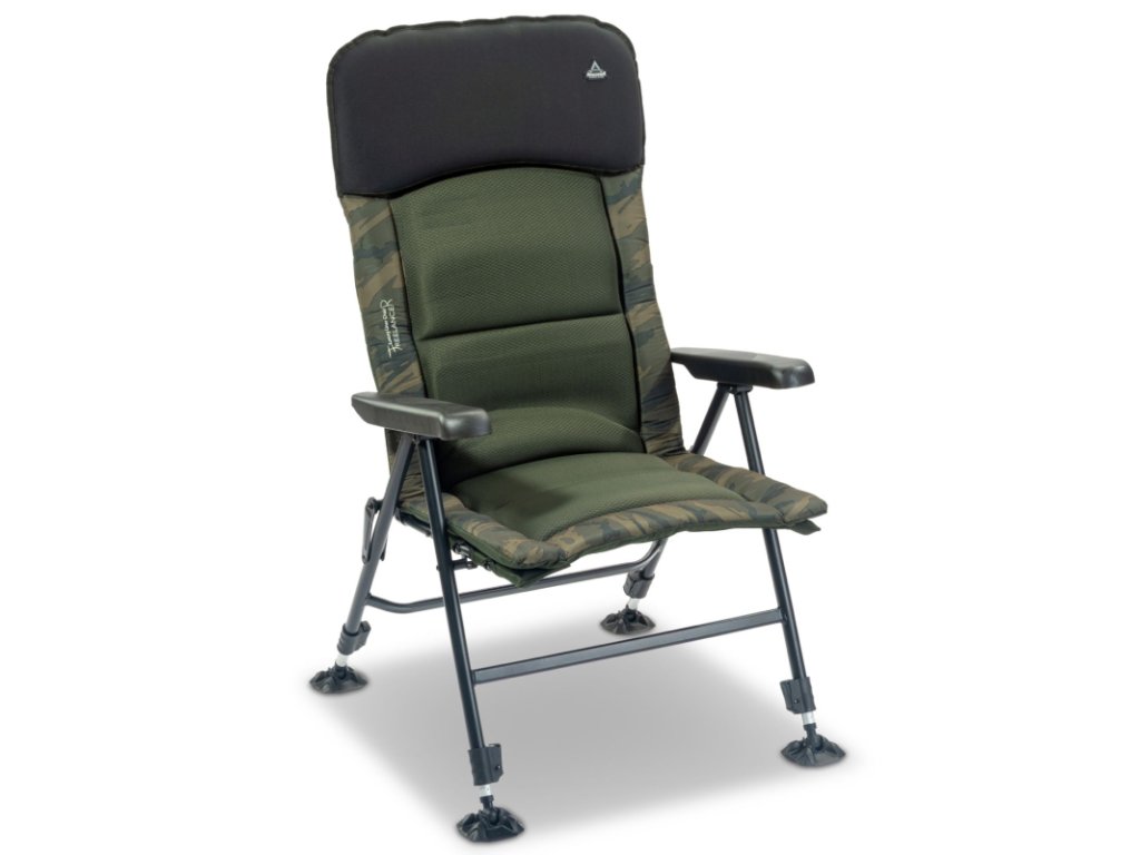 Opěrku zad lze nastavit pomocí aretačního systému až do úhlu 135°, takže si můžeš snadno zvolit ideální polohu. Křeslo má čtyři teleskopické nohy s extra širokými bahenními patkami, které zabraňují boření do měkkého terénu. Vodoodpudivý potah z 600 × 300D polyesteru doplňuje stylový Freelancer camo design. Součástí je také komfortní neoprenový polštář.