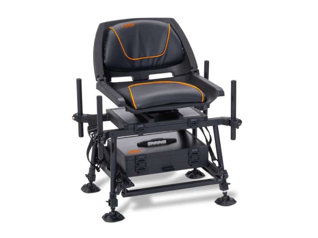 Nová plavačková bedna od MS-R je tím nejlepším základem pro pohodlný lov s feederem či na plavanou. Je vybavena plastovým skořepinovým sedákem, který lze otáčet díky kuličkovým ložiskům, opěrku lze navíc sklopit, to oceníte především při převážení. Maximální pohodlí zajišťuje silné polstrování sedáku i zad. Samozřejmostí jsou pak dvě vyjmutelné zásuvky na rybářskou bižuterii pod sedákem, čtyři plynule nastavitelné nohy s patkami proti zapadnutí do bláta a čtyři výškově nastavitelné tyče pro upevnění rohatinek či jiných nástavců. Včetně závitu na horní straně a silně polstrovaného ramenního popruhu, který je součástí balení. Na spodní straně jsou kolejnice pro umístění podnožky. Na zadní straně sedacího boxu je připevněna vodováha pro přesné vyrovnání. Vše je vyrobeno z korozivzdorného hliníku a plastu.