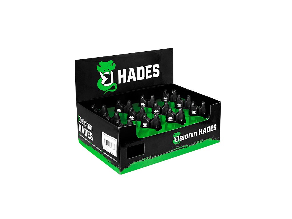 Delphin HADES je cenově velmi dostupný elektronický signalizátor záběru. Nabízí základní funkce světelné a zvukové signalizace. Je vybaven jednou záběrovou LED diodou a detekuje záběr v obou směrech. Jeho ovládání je opravdu velmi jednoduché a zvládne ho každý. Na spodní straně se nachází vstup pro 2,5mm jack konektor, a proto je možné i připojení závěsného signalizátoru záběru se zabudovanou světelnou signalizací. V přední části se nacházejí dva otočné ovladače. Vrchní ovladač slouží kromě ovládání hlasitosti i jako vypínač s aretací. Spodním ovladačem si můžete nastavit požadovanou výšku tónu. Signalizátor je vodotěsný, takže se o něj nemusíte obávat ani během deštivých dnů. Napájení je prostřednictvím 1 x 9V baterie. Při odběru 12 kusů signalizátorů HADES vám budou doručeny v pěkném prezentačním obalu, který slouží pro přímý prodej ve vaší prodejně. Tento obal je vyhotoven v kombinaci zelené a černé barvy, a zaujme na první pohled.Doplňkové parametry